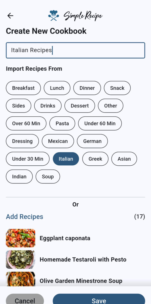 Whether through tags or manual selection, you are free to organize your recipes into cookbooks any way you like. There is also no limit on the number of cookbooks you can create.