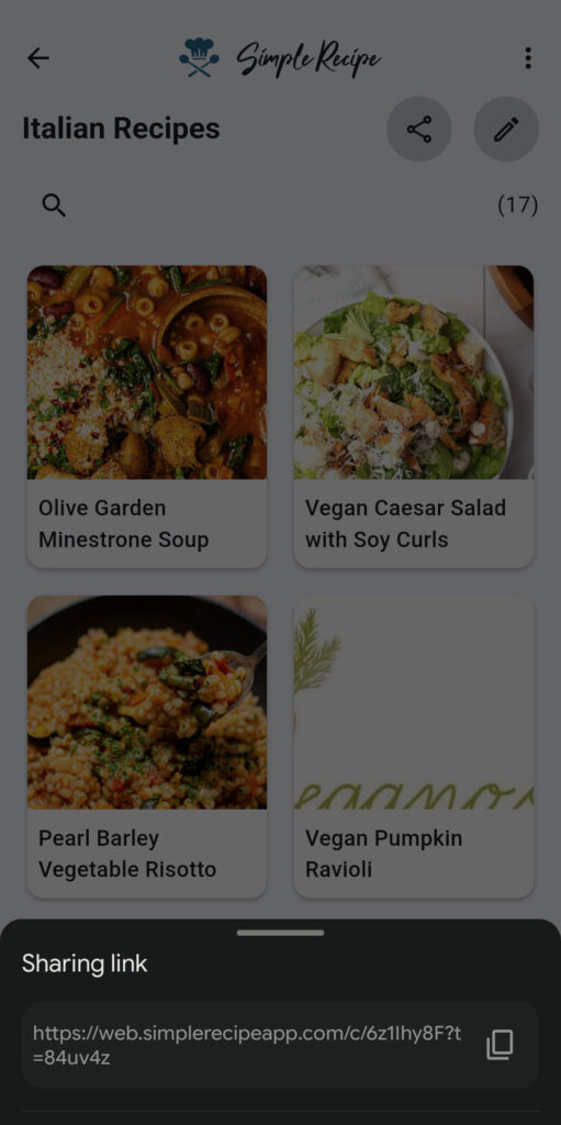 Once you’ve finished creating your cookbook, you can generate a share link to share the cookbook with family members or friends. Recipients will need to have the Simple Recipe app on their device to be able to click the link and import the cookbook into their app.